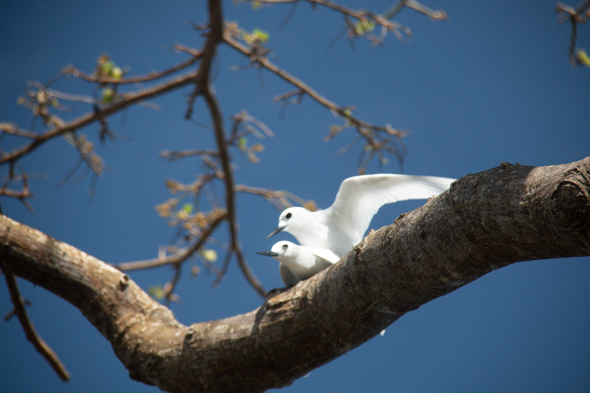 Dois Atobás descansando entre as árvores de Fernando de Noronha.